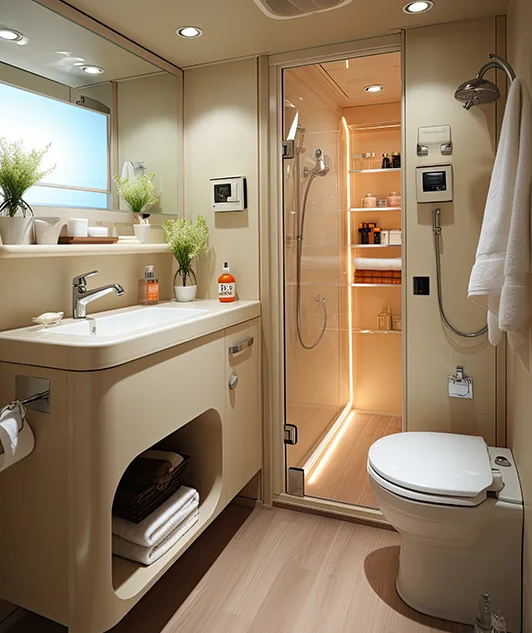 A small bathroom achieves the best combination of light and space by utilising fixtures designed most appropriately, while also incorporating mirrors at strategic locations to create the illusion of a larger area.