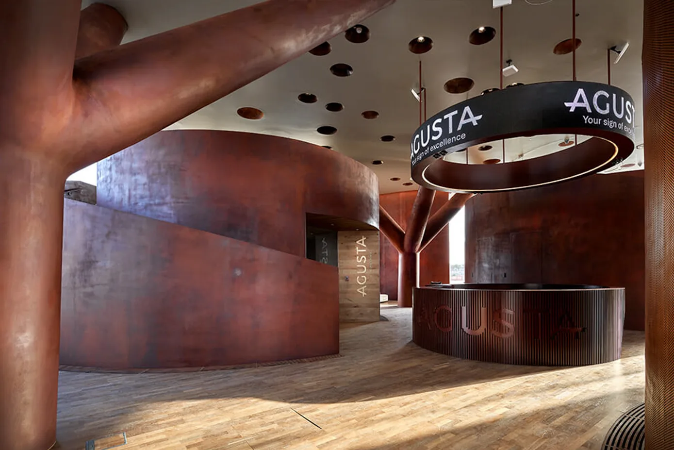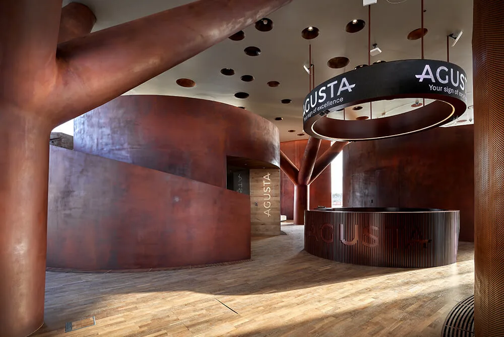 Located inside Expo the Casa Agusta pavilion consisted of a helipad, showroom and a lounge area. The purpose is to portray the development of a network point to point connections for urban and connections between cities. The terminal showcases digitally some of the state-of-the art Leonardo helicopters and provides an opportunity for business in a niche platform.