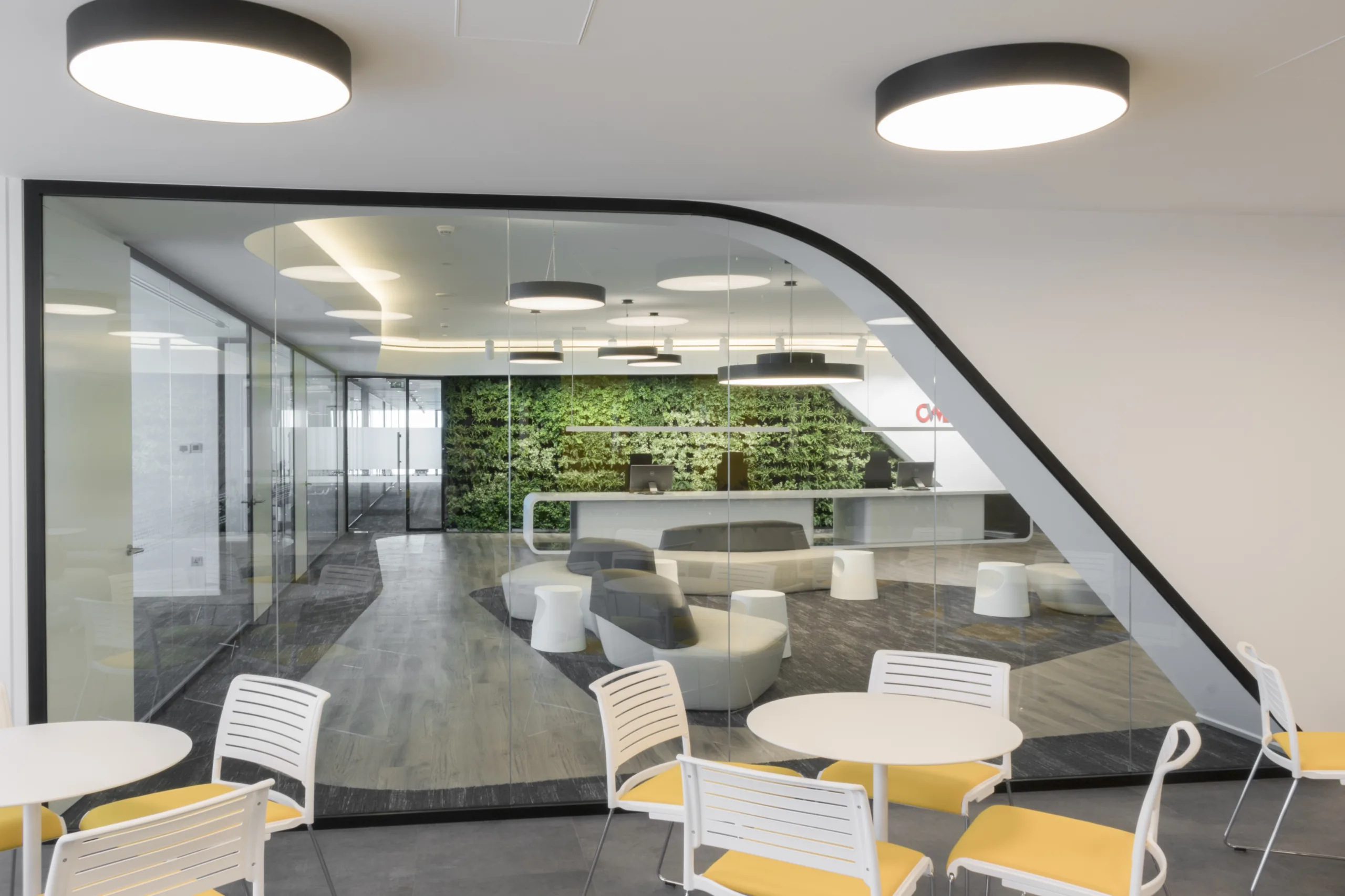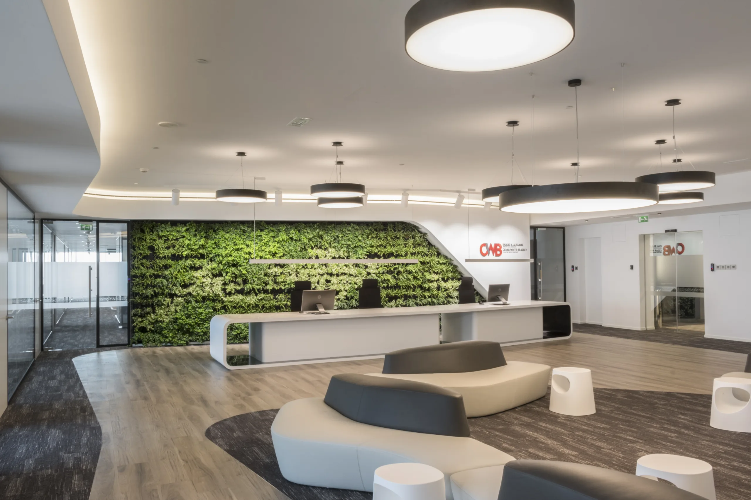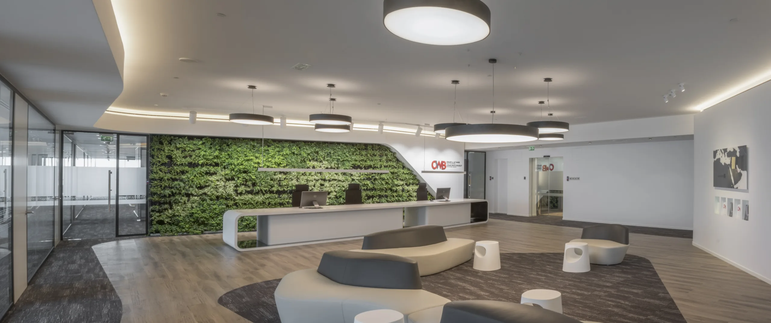 The design emphasizes clean lines, open spaces, and an abundance of natural light, which flows seamlessly through the office. A welcoming reception area adorned with a lush green wall sets the tone, reflecting the brand’s forward-thinking ethos and commitment to sustainability. The use of neutral tones, accented by vibrant pops of color, fosters a harmonious balance between professionalism and approachability.