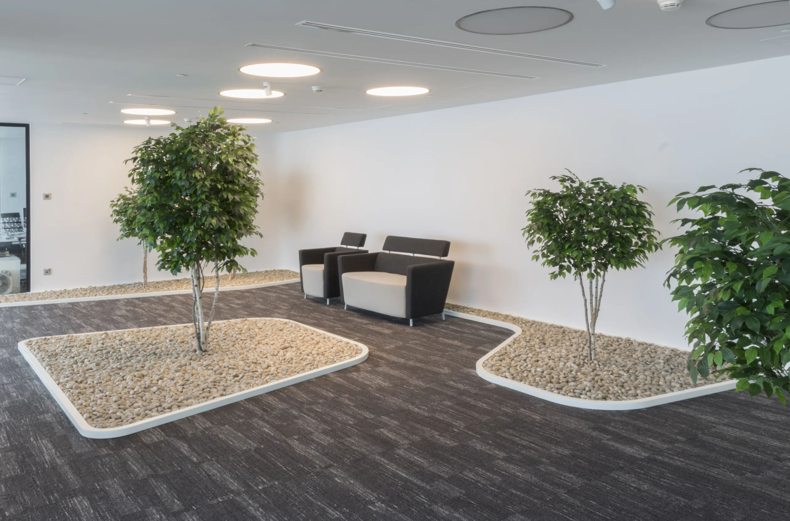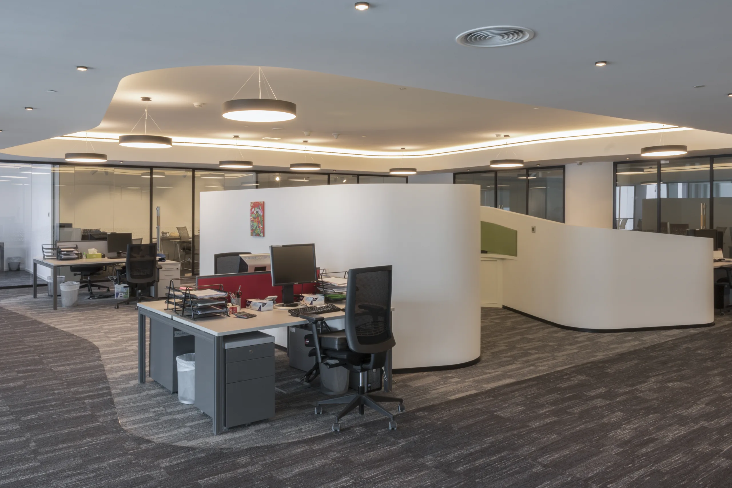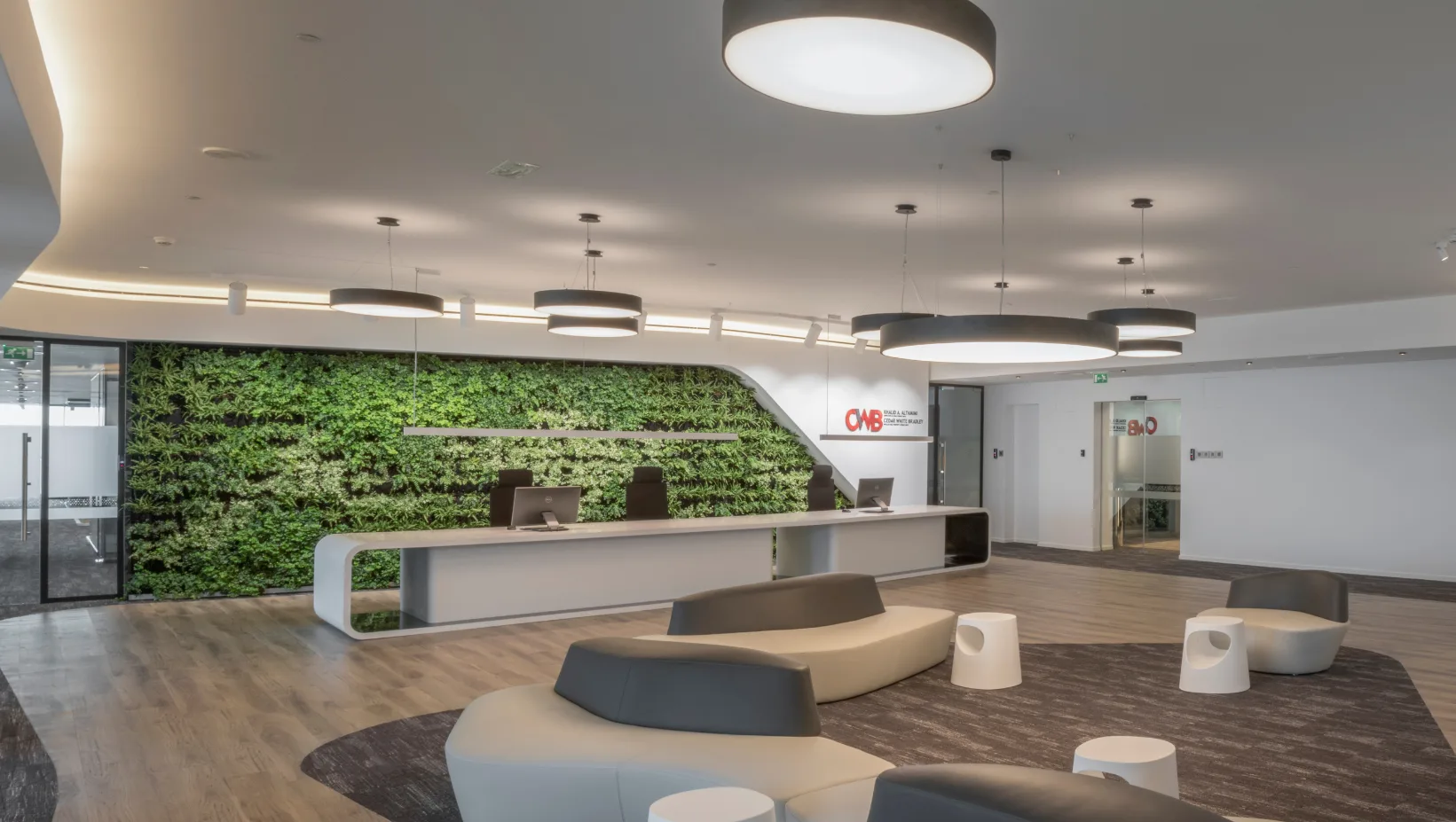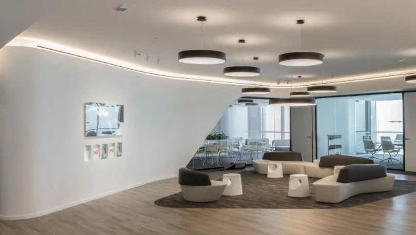 The integration of biophilic elements—such as greenery and organic forms—connects occupants to nature, enhancing well-being and productivity. Ergonomic furnishings and state-of-the-art lighting further ensure a comfortable and efficient workspace.