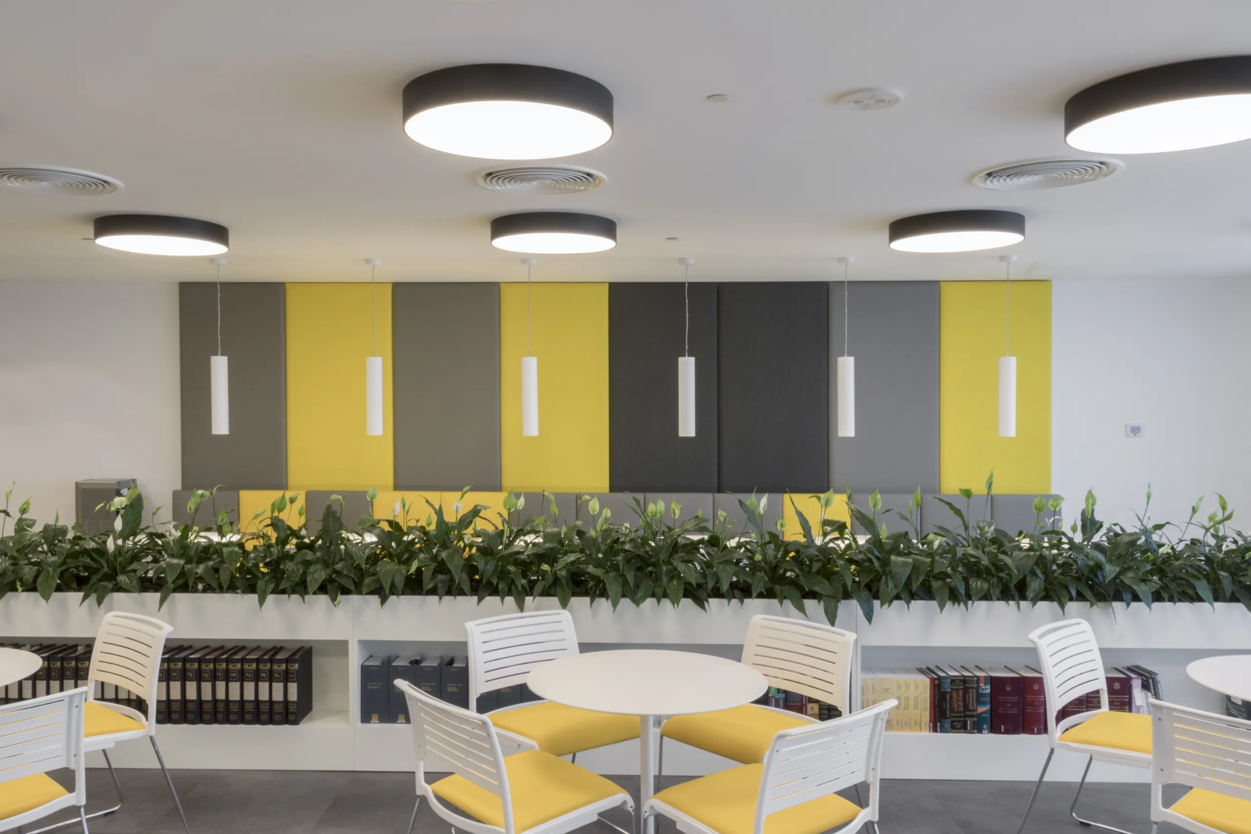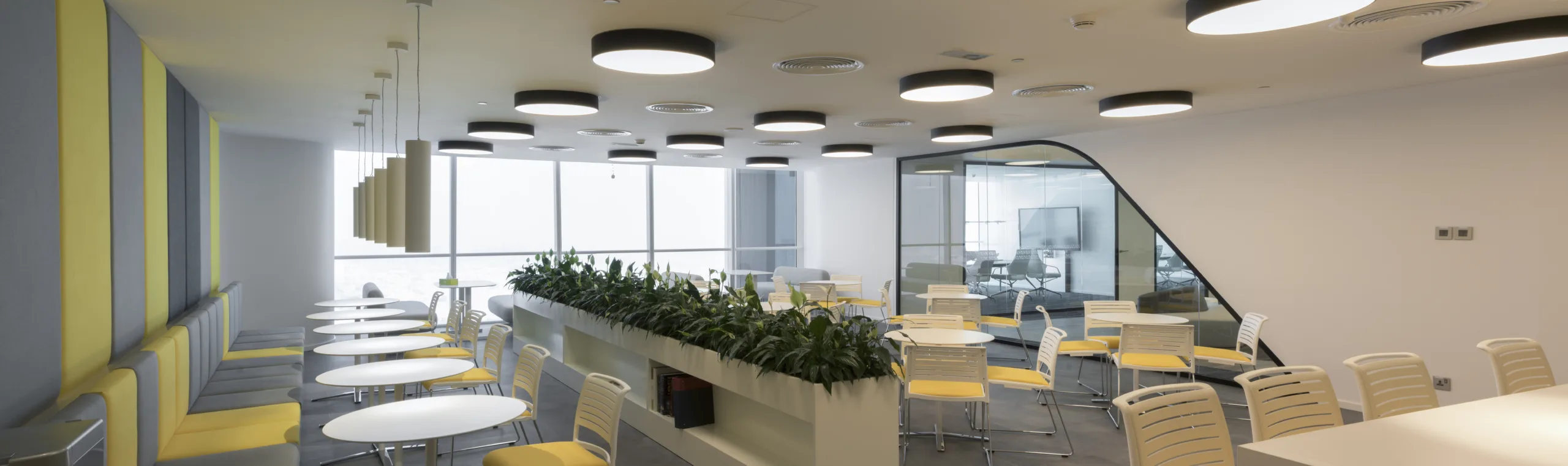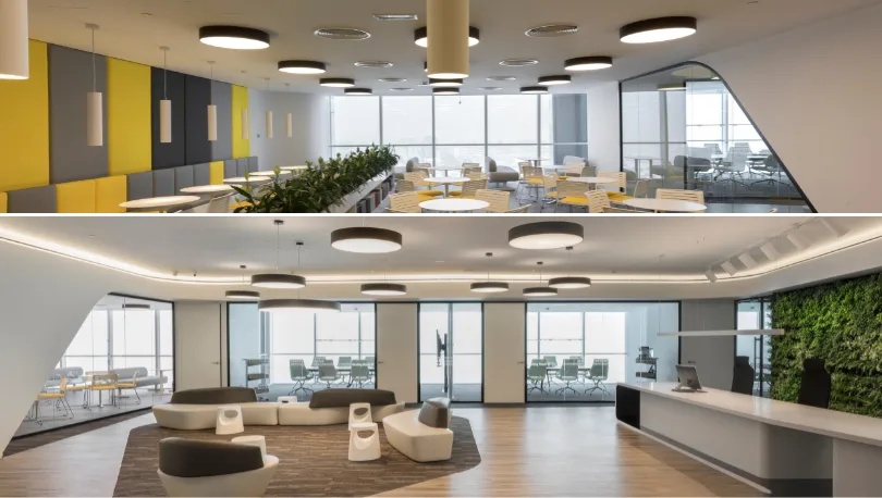 Thoughtfully zoned spaces cater to diverse workstyles. From contemporary meeting rooms equipped with advanced technology to breakout areas designed for casual interactions, every detail has been curated to enhance the user experience. The cafeteria is a standout feature, offering a vibrant, energizing space with bold acoustic panels and expansive views.