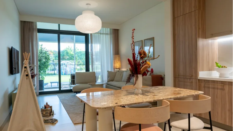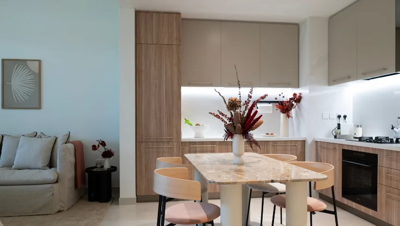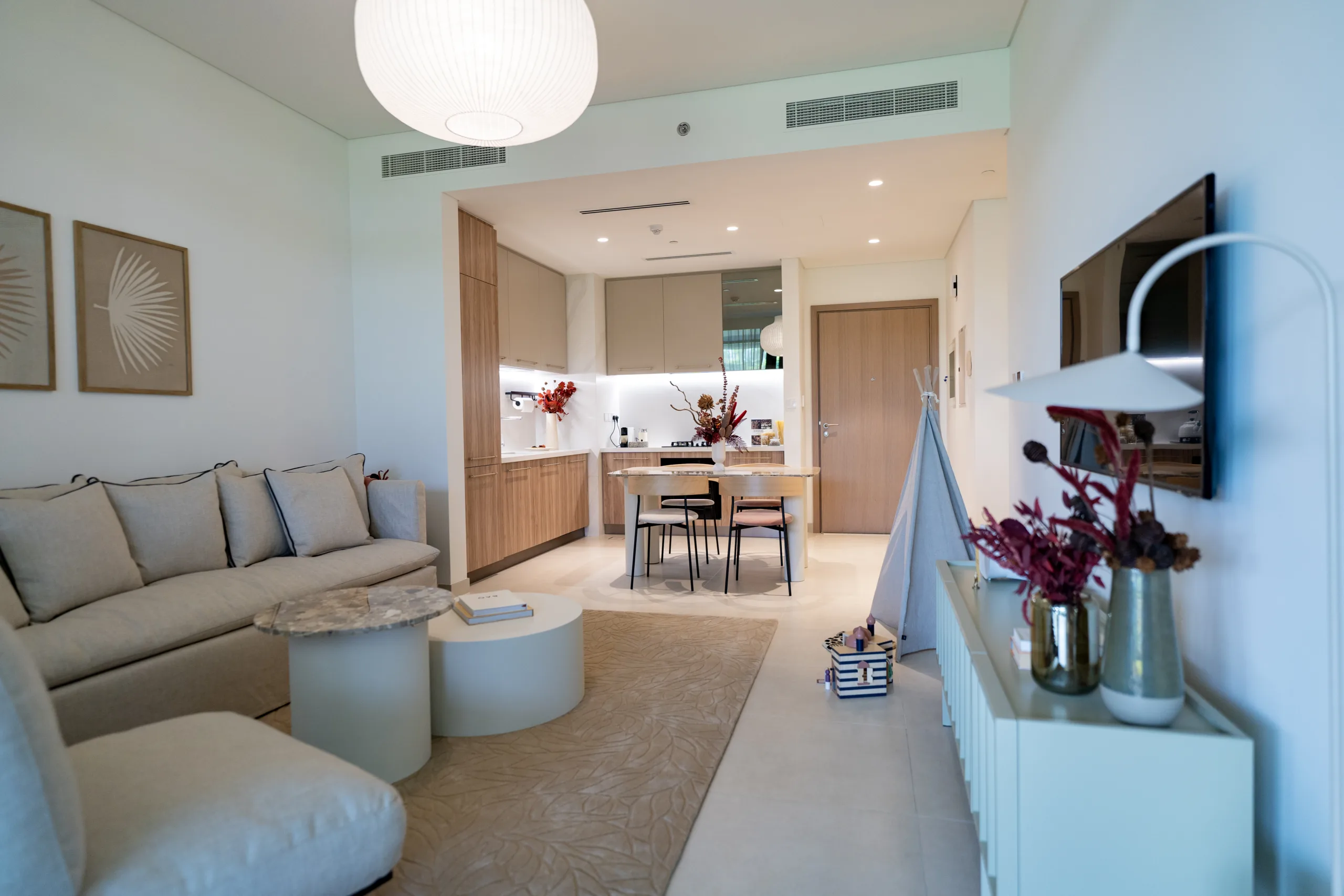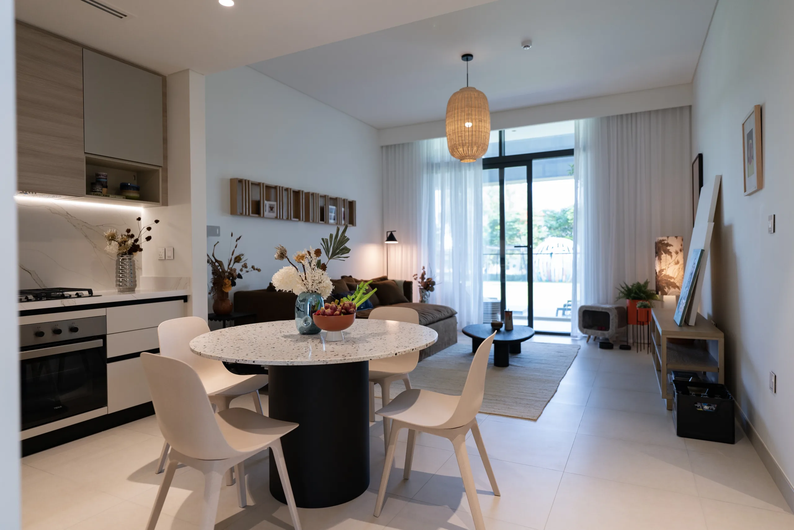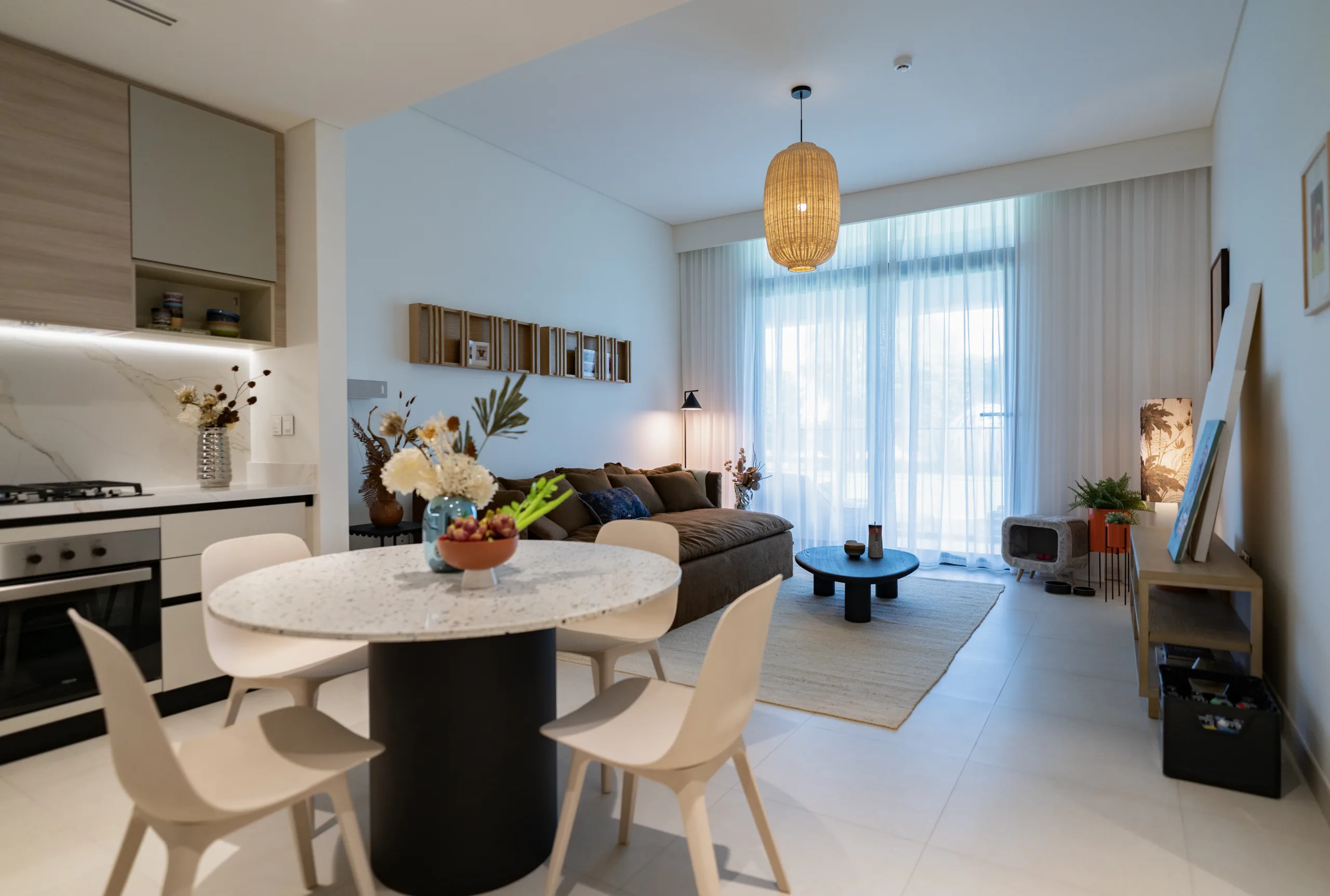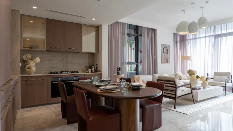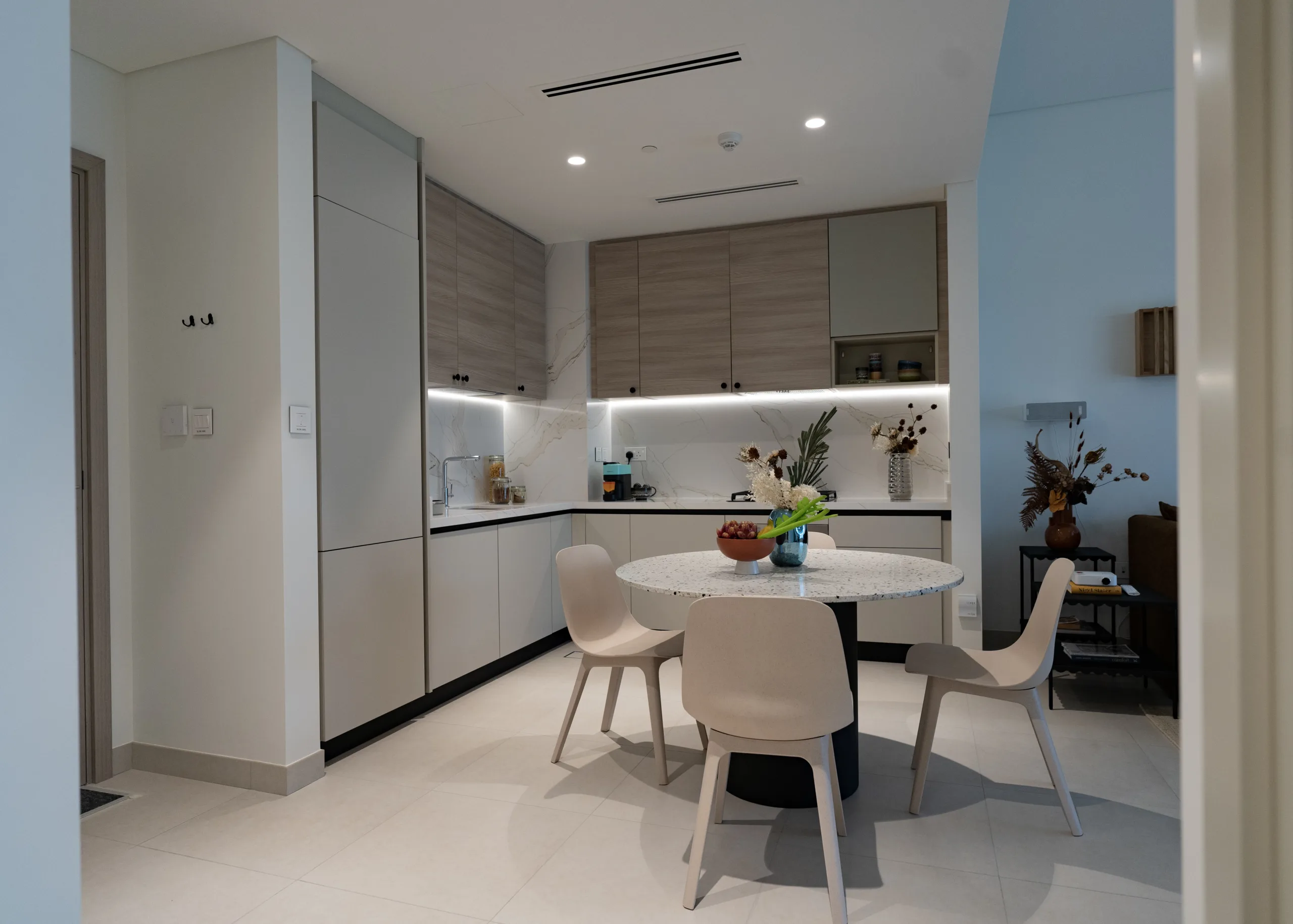 This show apartment reflects a refined balance between functionality and warmth, creating a welcoming ambiance for future residents. The design integrates contemporary aesthetics with subtle nods to natural textures and tones, achieving a cohesive flow across the living, dining, and kitchen areas.