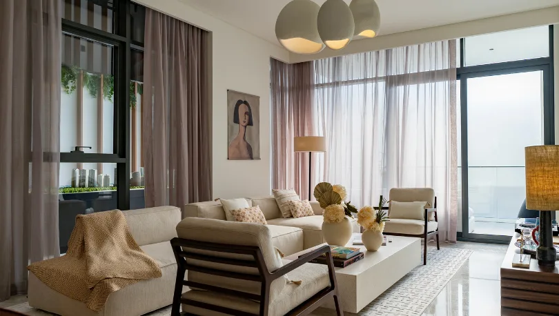 The open-concept living space is anchored by soft neutral furnishings, allowing the rich wooden accents to stand out. A curated mix of modern and mid-century furniture introduces character while ensuring comfort. Floor-to-ceiling windows draped with muted curtains frame the space, enhancing natural light and providing a soft contrast against the clean-lined architecture.