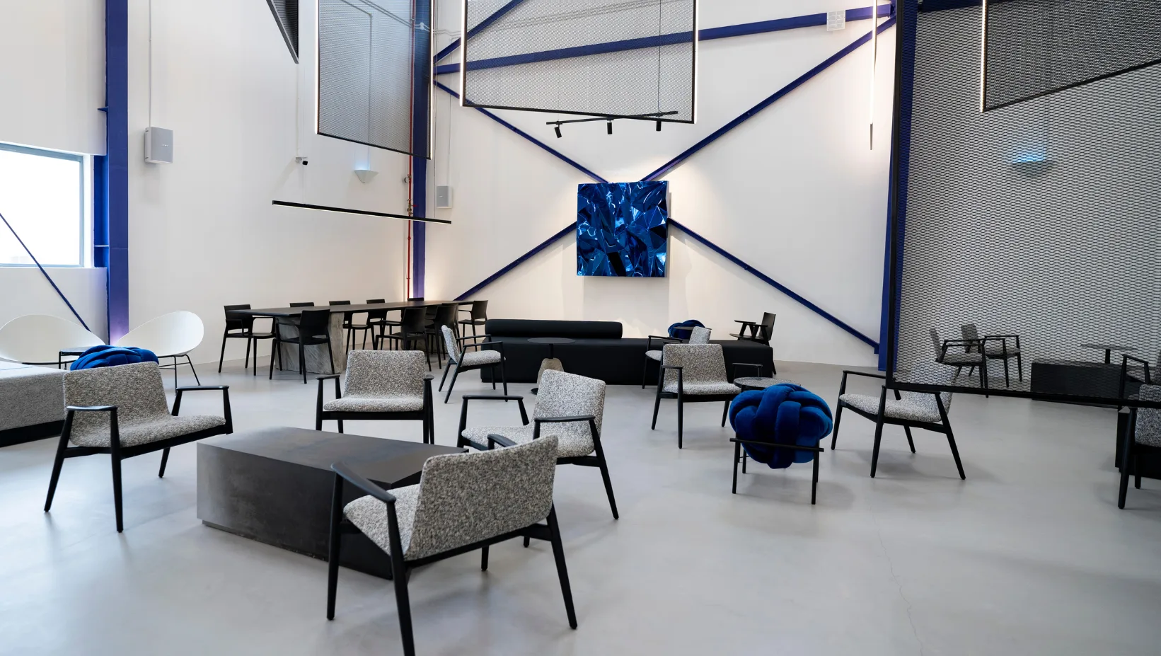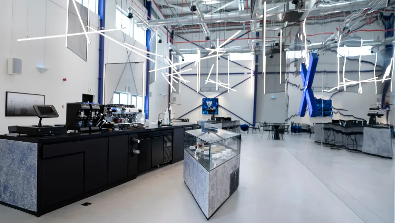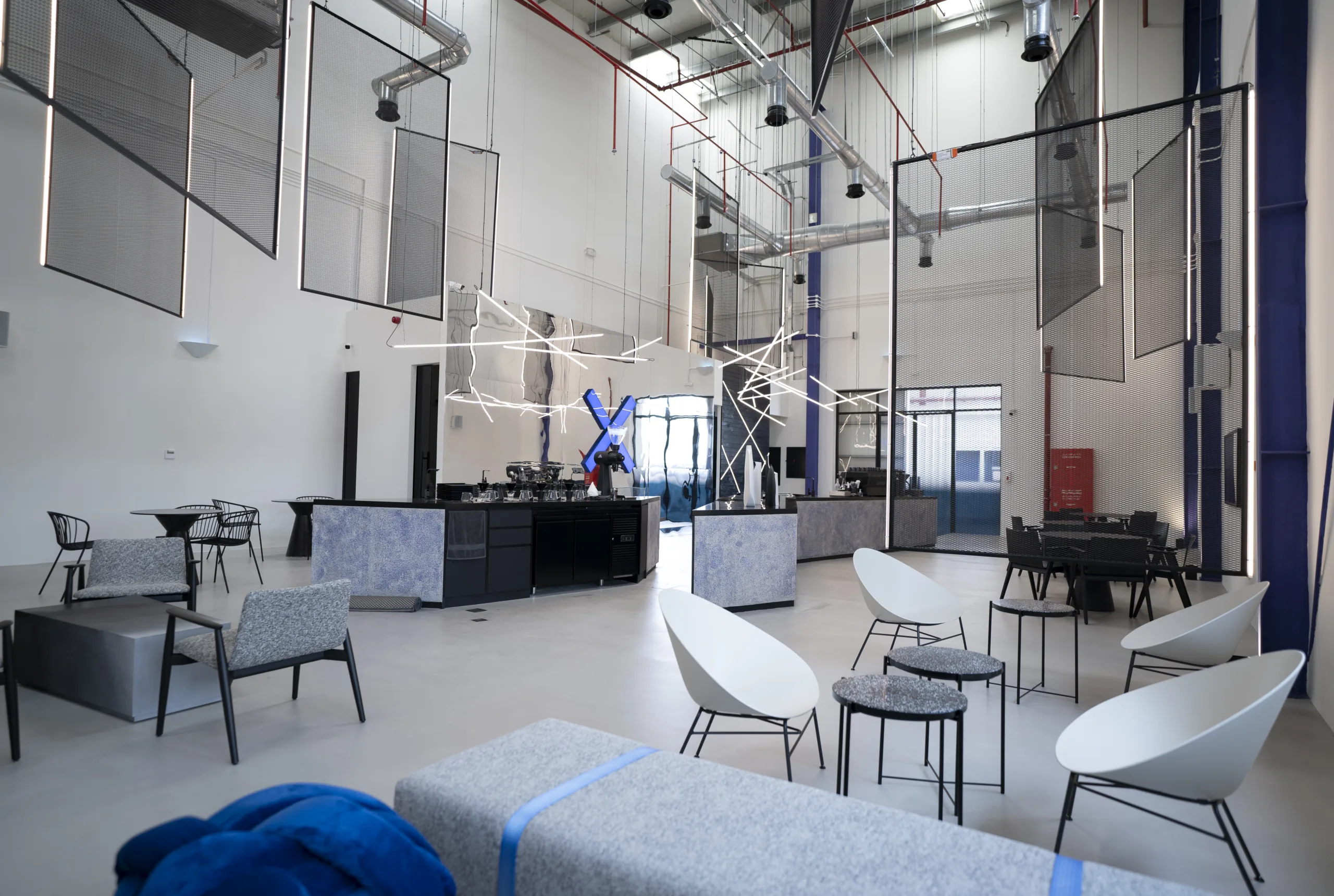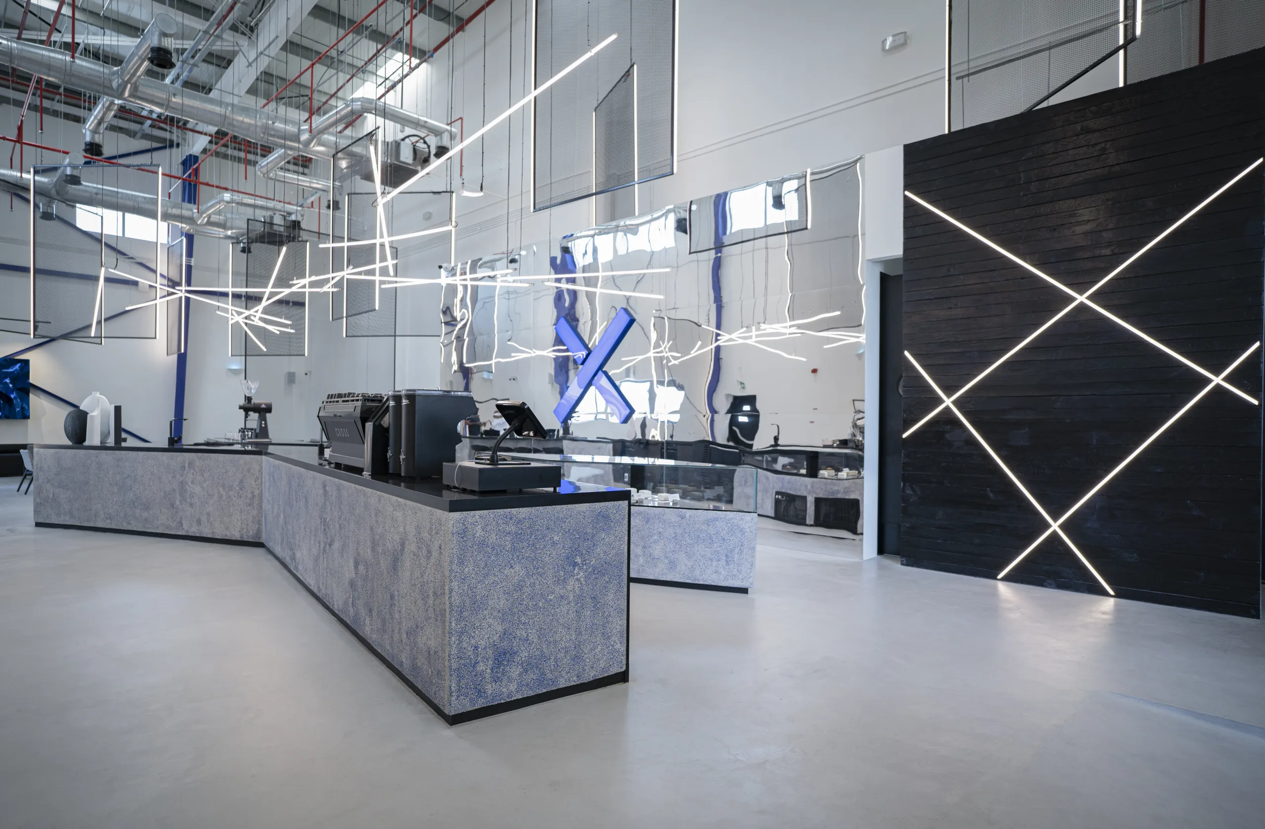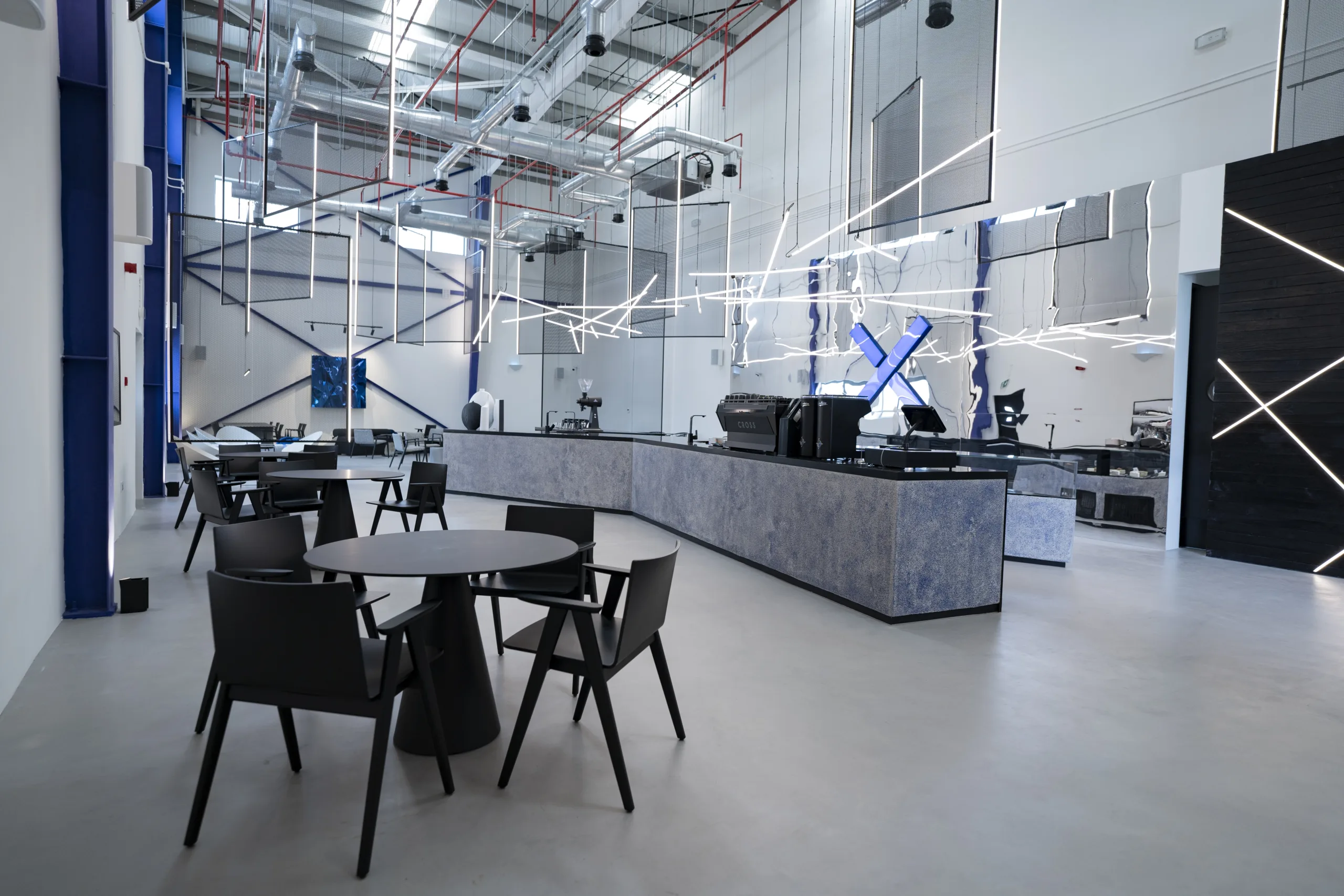 Eclectic, Stylish, Painted in Silvers Whites and Blues, the Cross Cafe in Al Khawaneej Built by Pinnacle Interiors spans over 280 Sq.m and gives a cozy yet industrial look and feel to the users of the space.