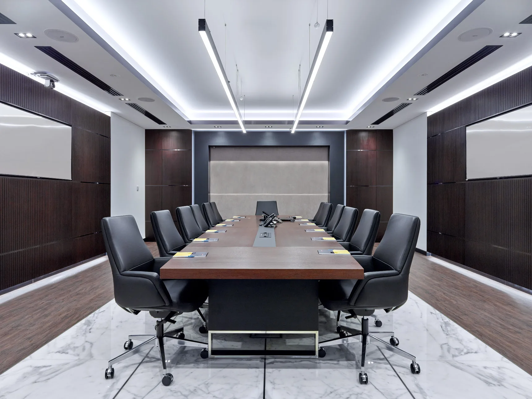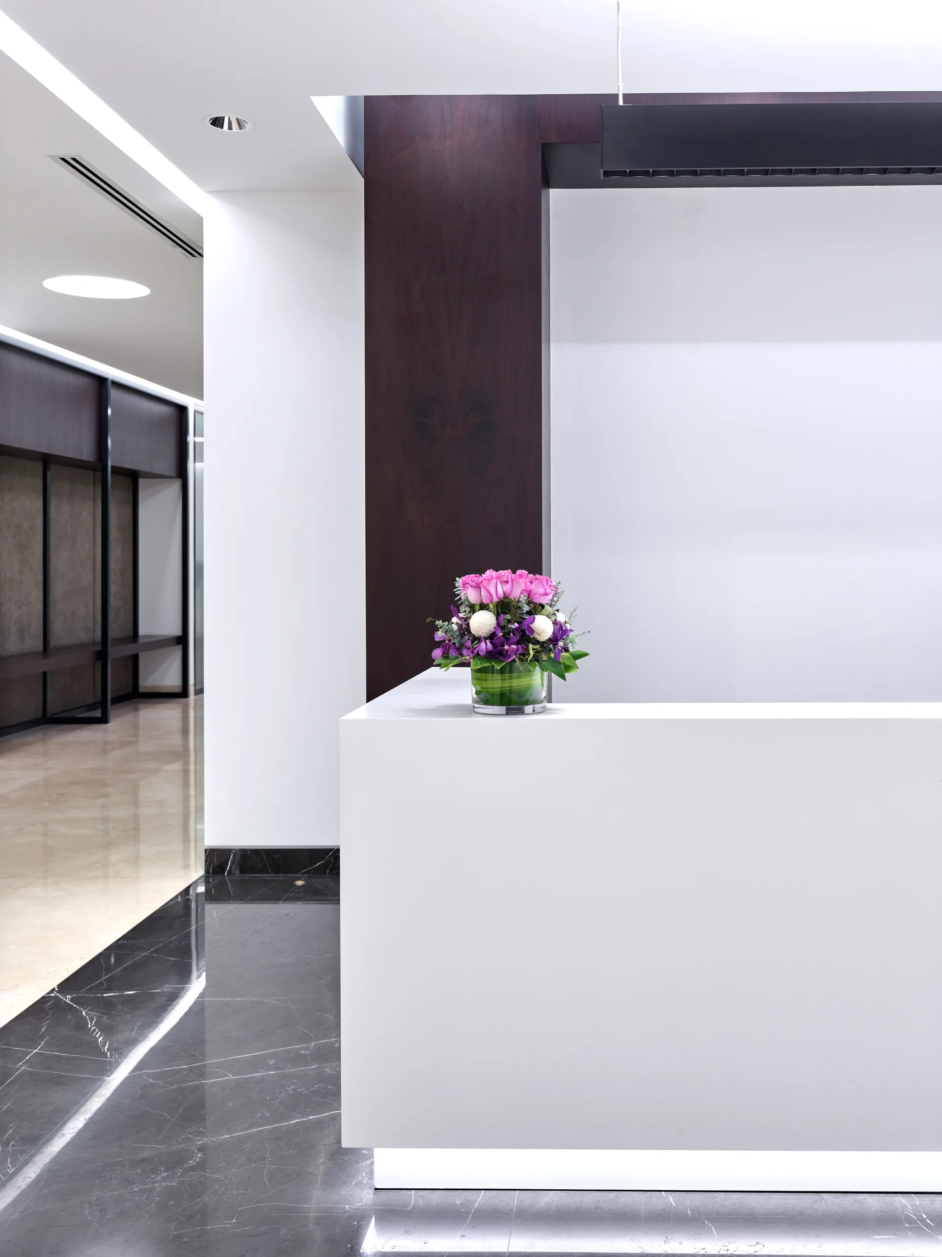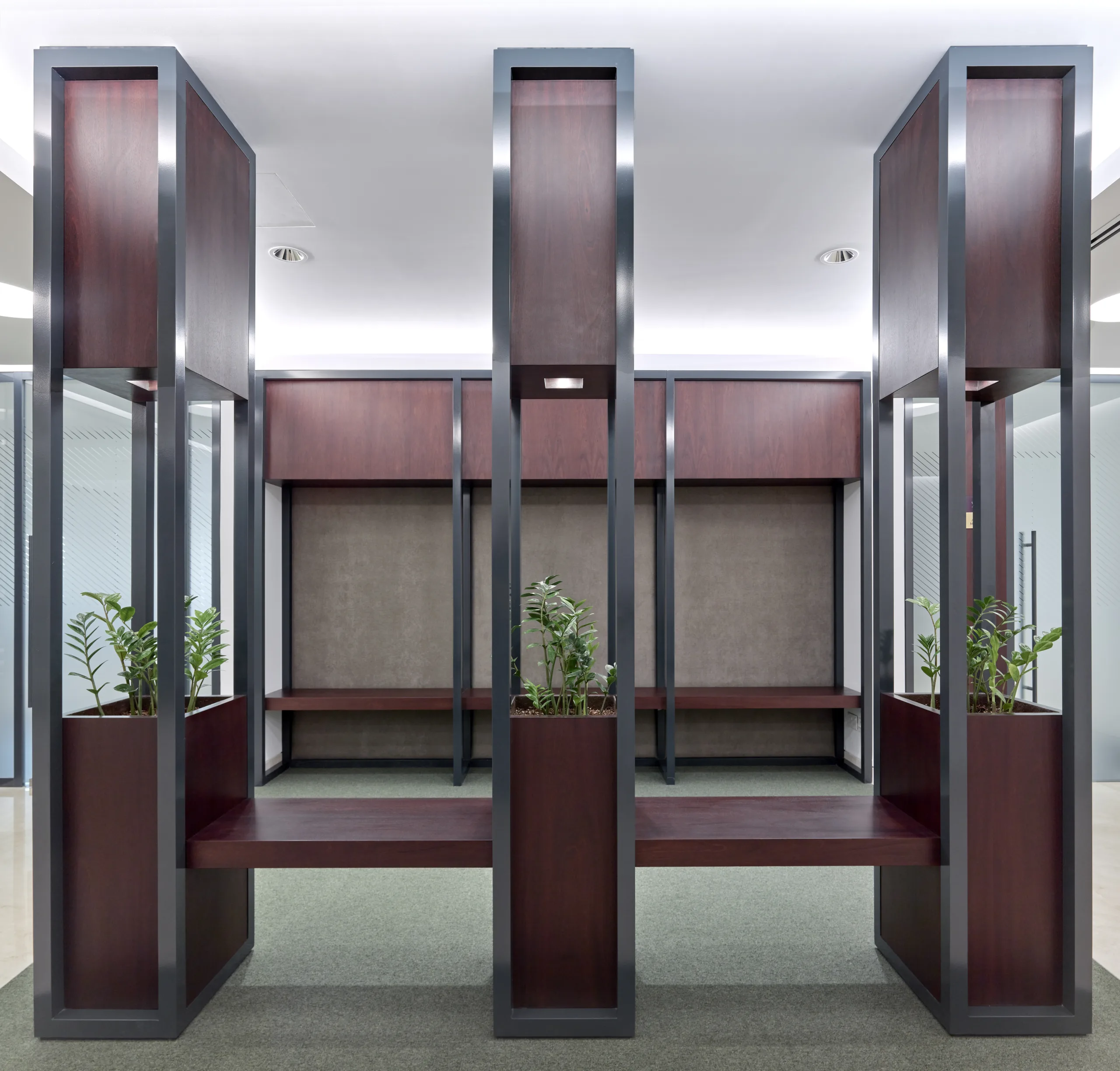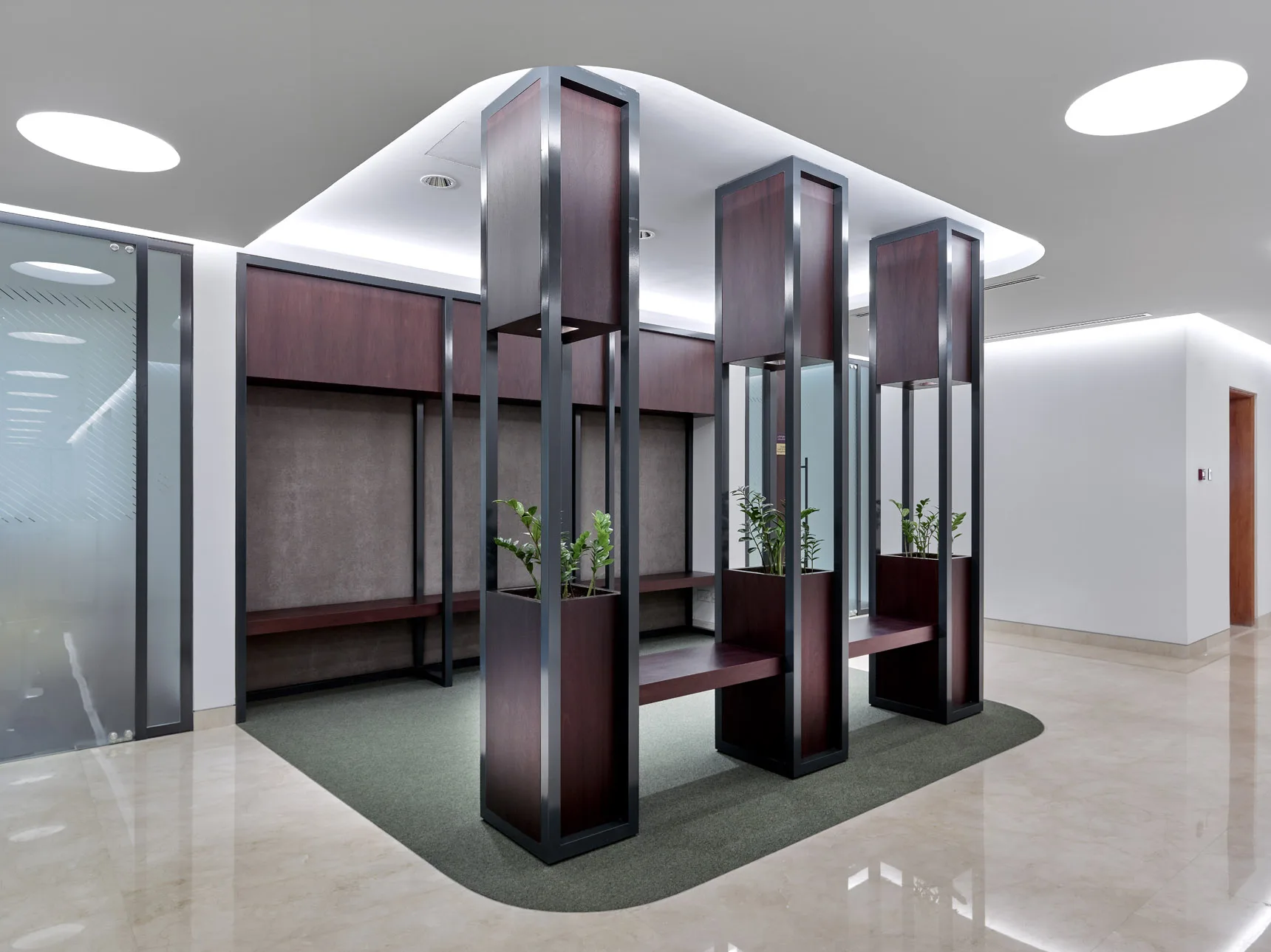 A stunning contemporary corporate office, elegantly designed and styled with clean lines, minimalistic, customized joinery.
