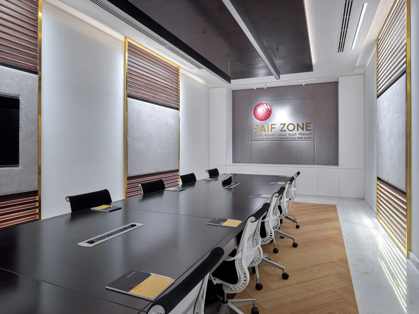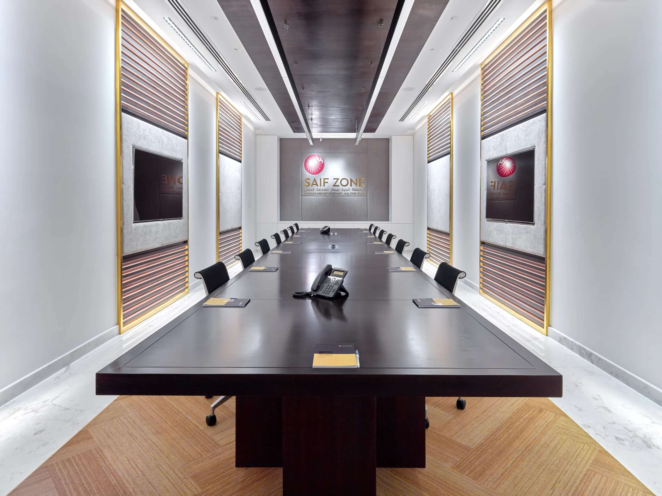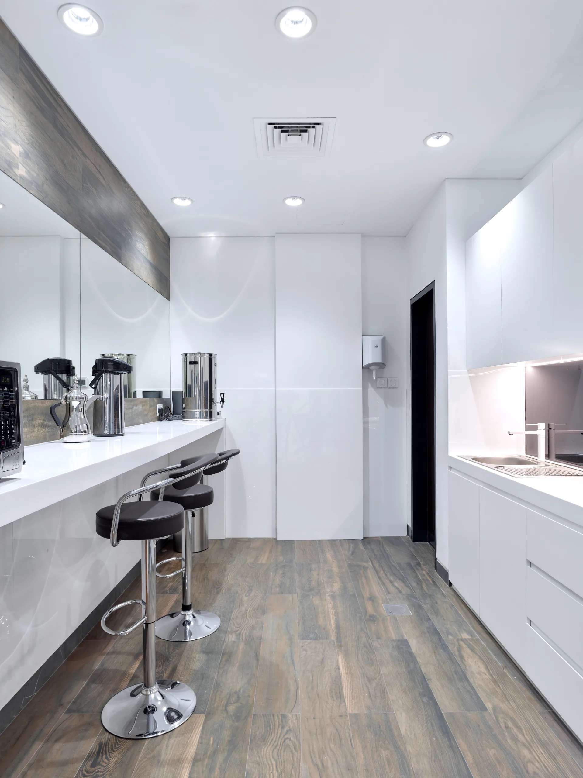 A stunning contemporary corporate office, elegantly designed and styled with clean lines, minimalistic, customized joinery.