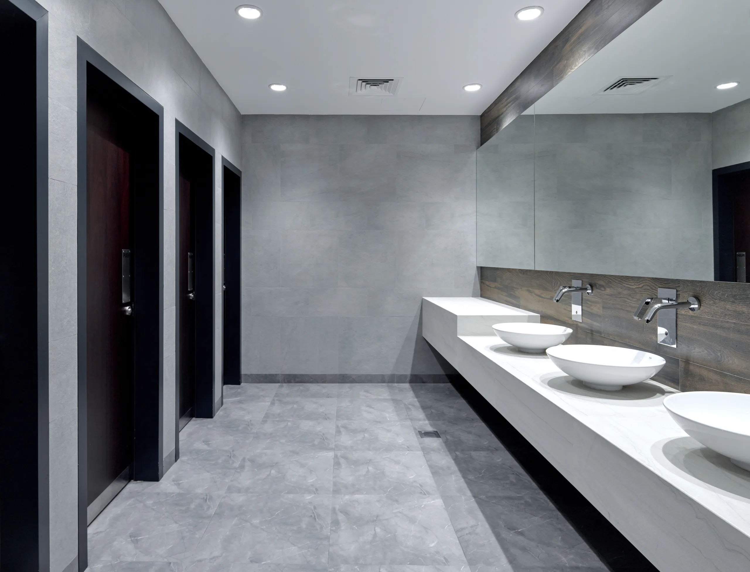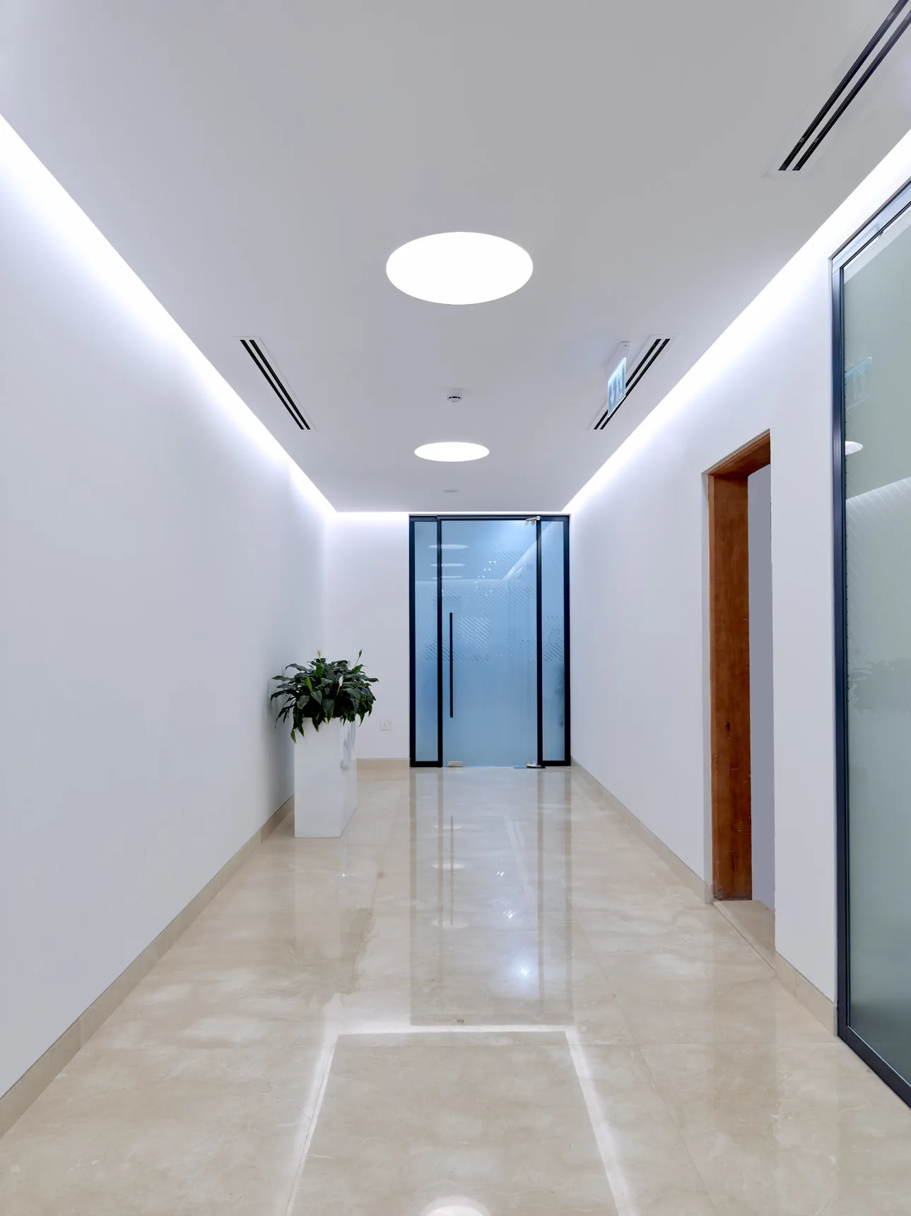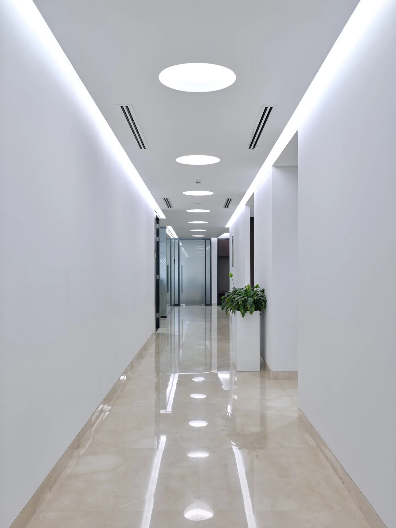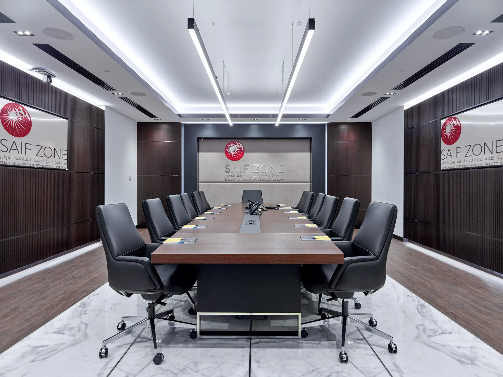 A stunning contemporary corporate office, elegantly designed and styled with clean lines, minimalistic, customized joinery.