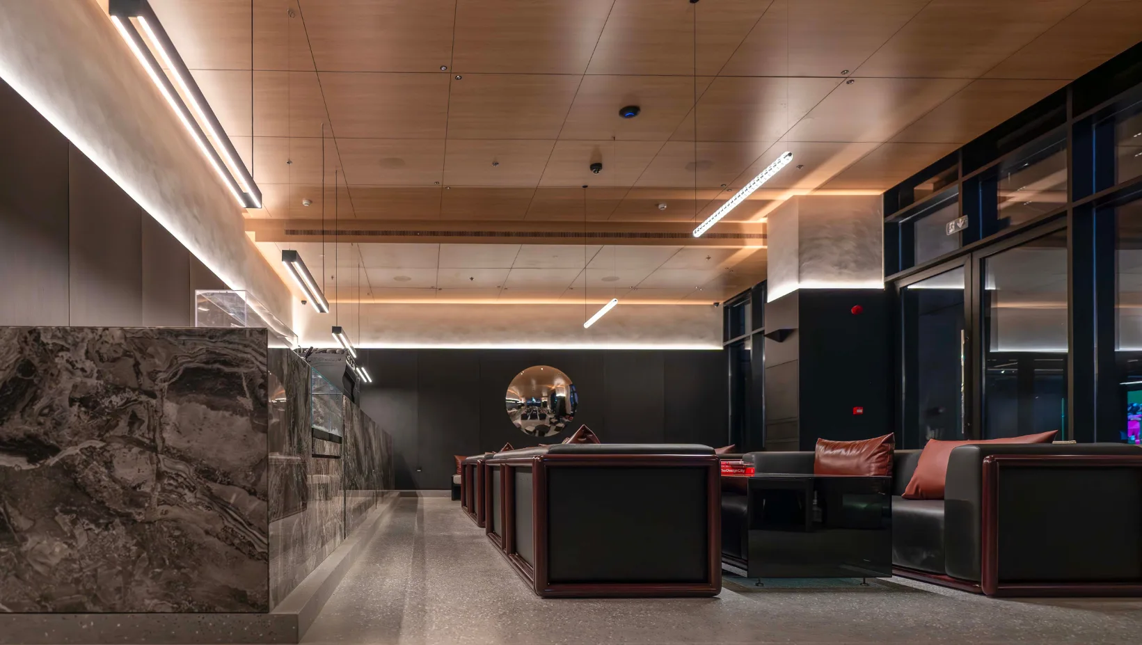 The Grey Cafe is a contemporary cafe that blends mosaic detail, sleek marble, and natural wood to create a refined and inviting ambiance.