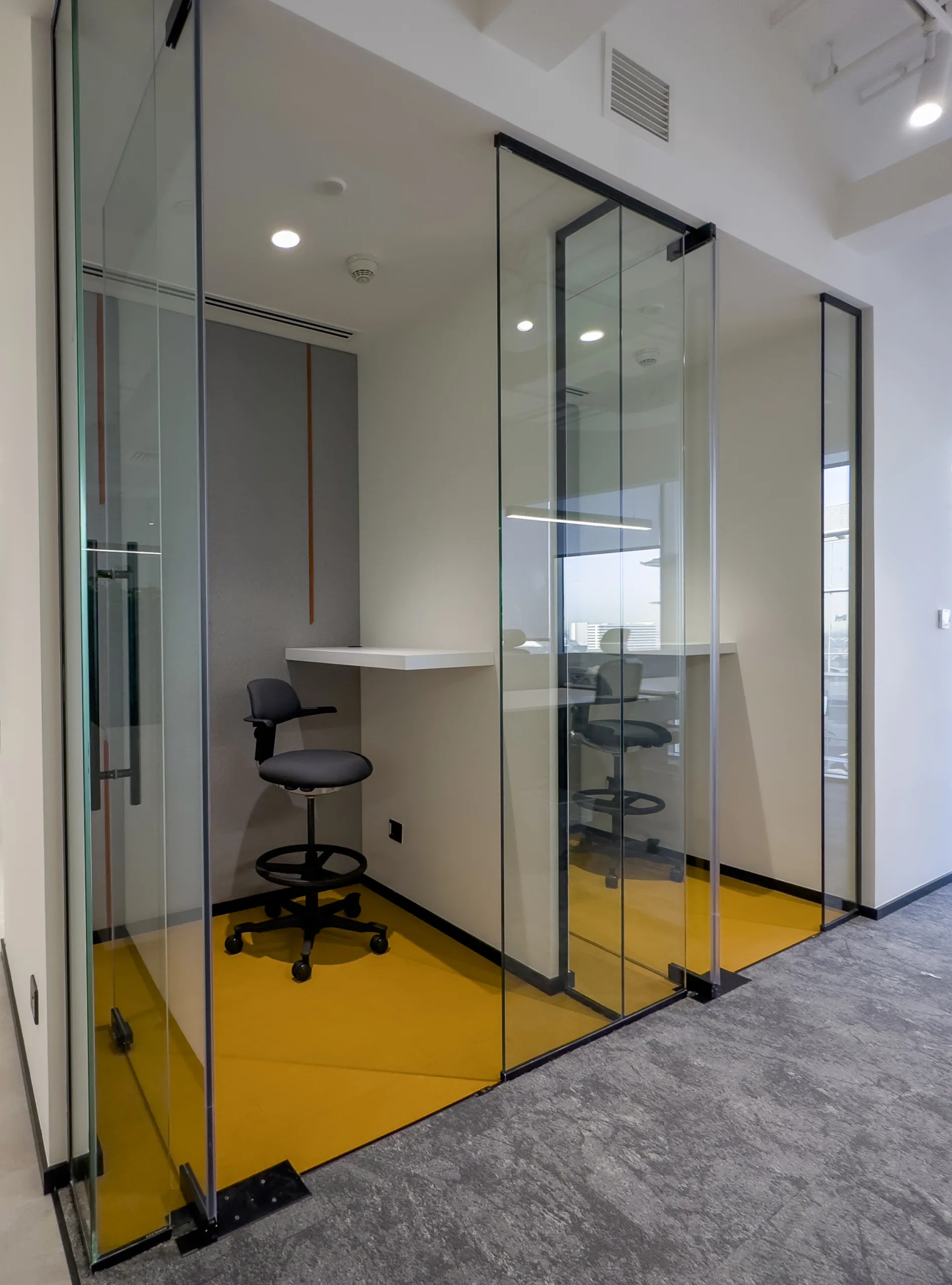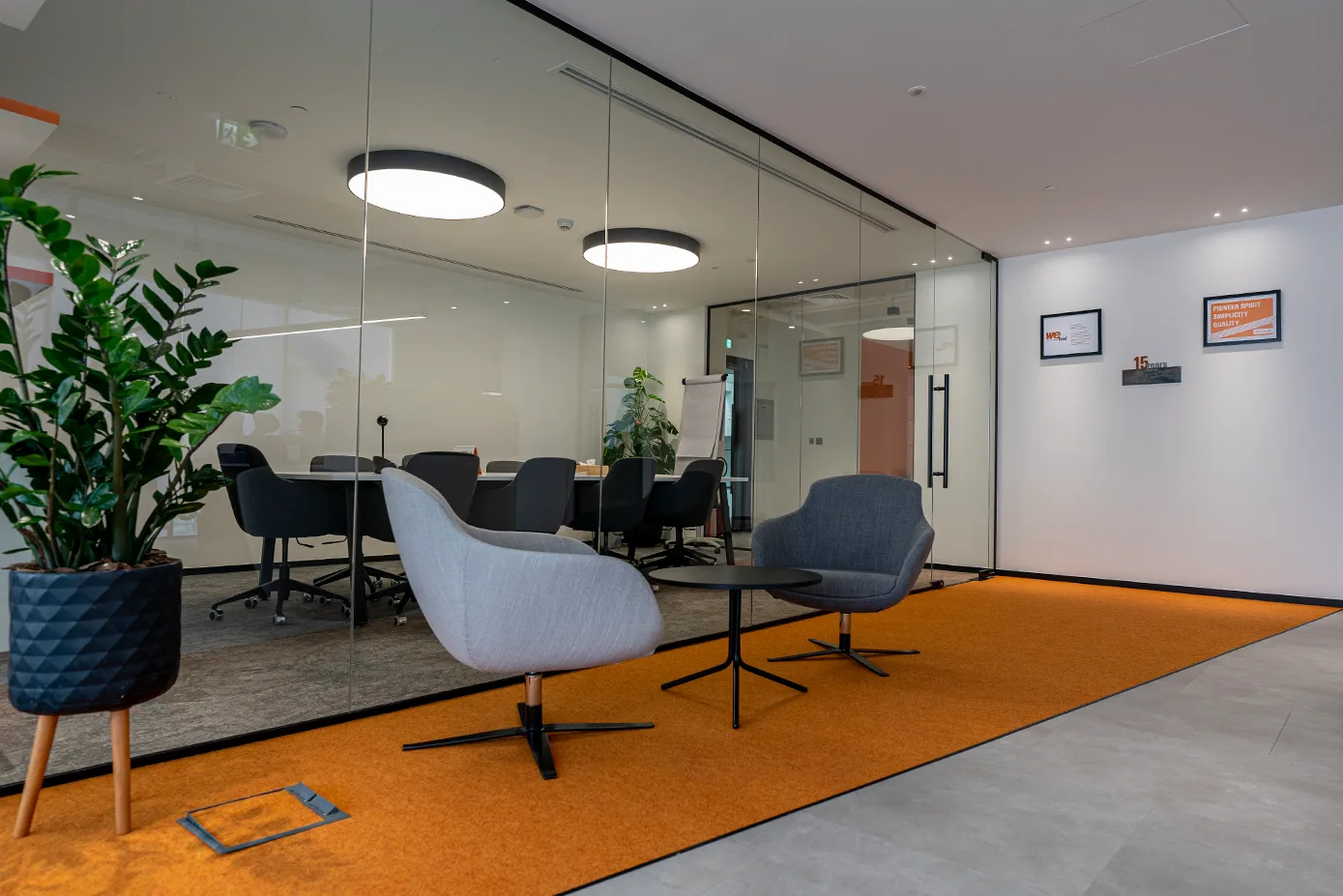 The office design balances modern aesthetics with the company’s corporate branding of their signature warm orange and black which our designers have utilized tastefully to avoid being overwhelming ensuring a professional and welcoming environment.