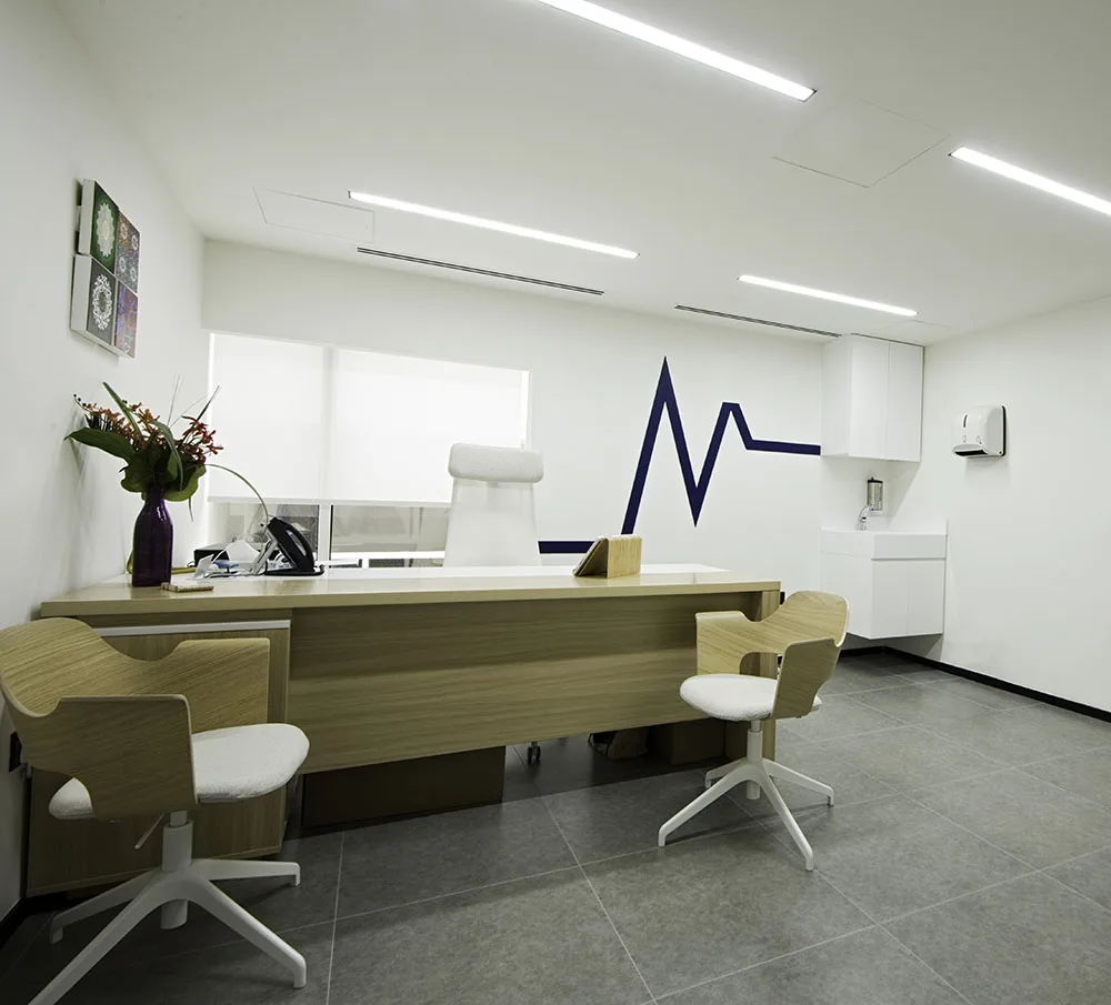 For a wellness center that offers consultation and services in– Fertility & Reproductive health, Integrated Nutrition & Dietetics, Psychiatry & Behavioral health, it was important that our team approached the project with utmost care and responsibility. The interior design features an elegant contrast of deep blue and sheer white complete with a stylish doctor’s lounge in the mezzanine floor, a theatre style AV room and more.